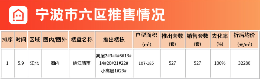 上周僅一個(gè)項(xiàng)目加推,為江北的姚江晴雨。項(xiàng)目位于姚江新城板塊,賣點(diǎn)主要以姚江新城地段及未來(lái)規(guī)劃,近軌交4號(hào)線(洪塘中路站),一線臨江,世外學(xué)校教育資源,內(nèi)部商業(yè)配套,價(jià)格倒掛優(yōu)勢(shì)為主,去化率100%。