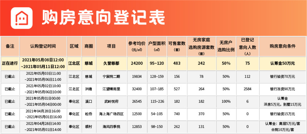 上周,共有6盤確定認(rèn)籌,除去已于前日(5月9日)開(kāi)盤的姚江晴雨外,本周還將迎來(lái)5個(gè)項(xiàng)目入市,但從目前的意向登記人數(shù)來(lái)看,堪稱慘淡,其中江北慈城的久譽(yù)慈郡和寧宸院二期都是由圈外晉升到圈內(nèi)的項(xiàng)目,稀缺的房票也讓原先一大批懷抱投資需求的主城區(qū)剛需外溢客戶“有心無(wú)力”。