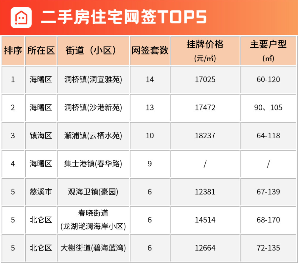 熱門成交小區(qū)TOP5中,海曙區(qū)的洞橋鎮(zhèn)(洞宣雅苑),上周成交14套,位居第一,掛牌均價(jià)分別為17025元/平;海曙區(qū)的洞橋鎮(zhèn)(沙港新苑)和鎮(zhèn)海區(qū)的澥浦鎮(zhèn)(云棲水苑)則分別位列第二,第三名。